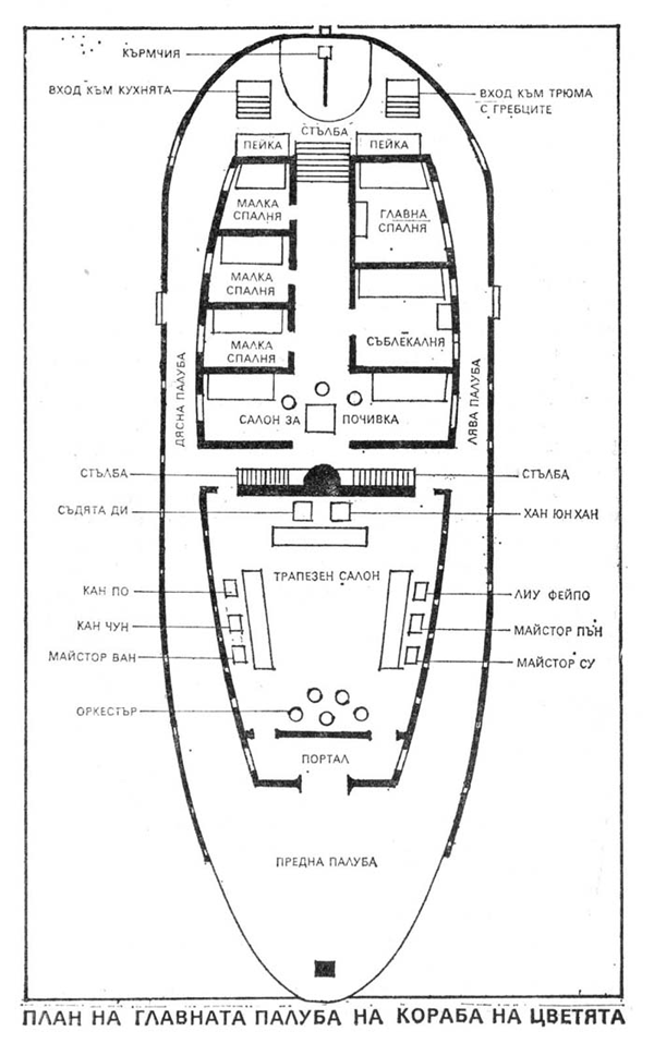 — Вашият покорен слуга потвърждава, че е видял първо Ван, а после господин Лиу да напускат този салон. След като останах сам на масата, започнах разговор с двете момичета, които изиграха танца със сабите, докато едното посочи левия ми ръкав, целия напоен с рибен сос. Станах и отидох до втората кабина в коридора. Тя беше запазена за мене и слугата ми бе оставил там вързоп чисти дрехи и тоалетни принадлежности. Бързо се преоблякох. Когато излязох в коридора, видях Бадемов цвят, която вървеше пред мен към салона за почивка. Настигнах я при стълбата и изказах възхищението си от танца й. Но тя изглеждаше доста възбудена и набързо ми отговори, че ще се видим след малко в трапезния салон. После сви зад ъгъла към левия борд. Влязох през вратата откъм десния борд. Видях, че Ван, Лиу и Пън още не са се върнали, и продължих разговора си с двете момичета.