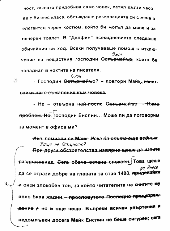 2. Остърмайър е дълго и тромаво име. След като го замених с Олин (посредством опцията „Replace“), с един замах успях да съкратя разказа с петнайсетина реда. Освен това, когато завърших „1408“, вече знаех, че разказът най-вероятно ще бъде включен в аудиокнига, която щях да чета сам. Никак не ме привличаше идеята да седя в тясната звукозаписна кабина и да повтарям по цял ден „Остърмайър, Остърмайър, Остърмайър“. Затова промених името.