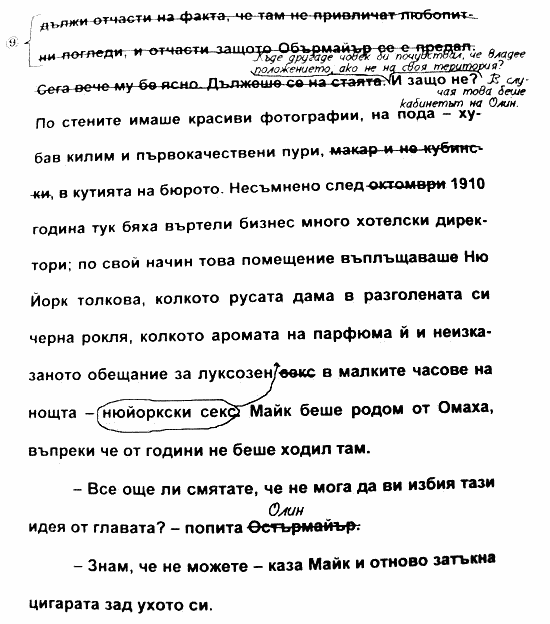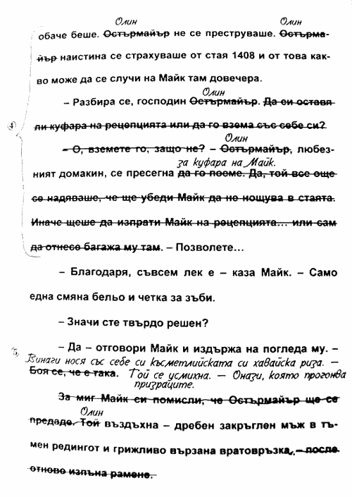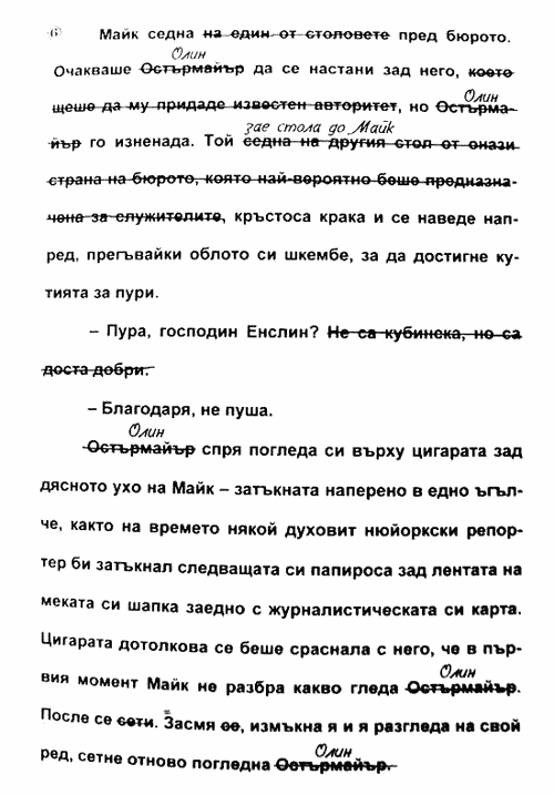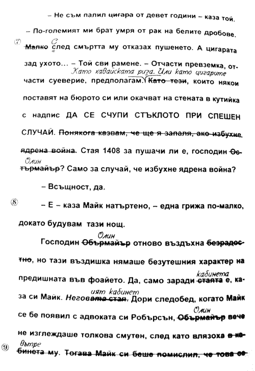6. В първия вариант четем: „Майк седна на един от столовете пред бюрото“. Е, ама наистина. Къде другаде да седне? Може би на земята? Едва ли, значи и това се маха. Това с кубинските пури също се задрасква. Не само че е клише, ами и лошите в долнопробните филми винаги казват: „Вземи си пура! Кубинска е!“ Ужас!