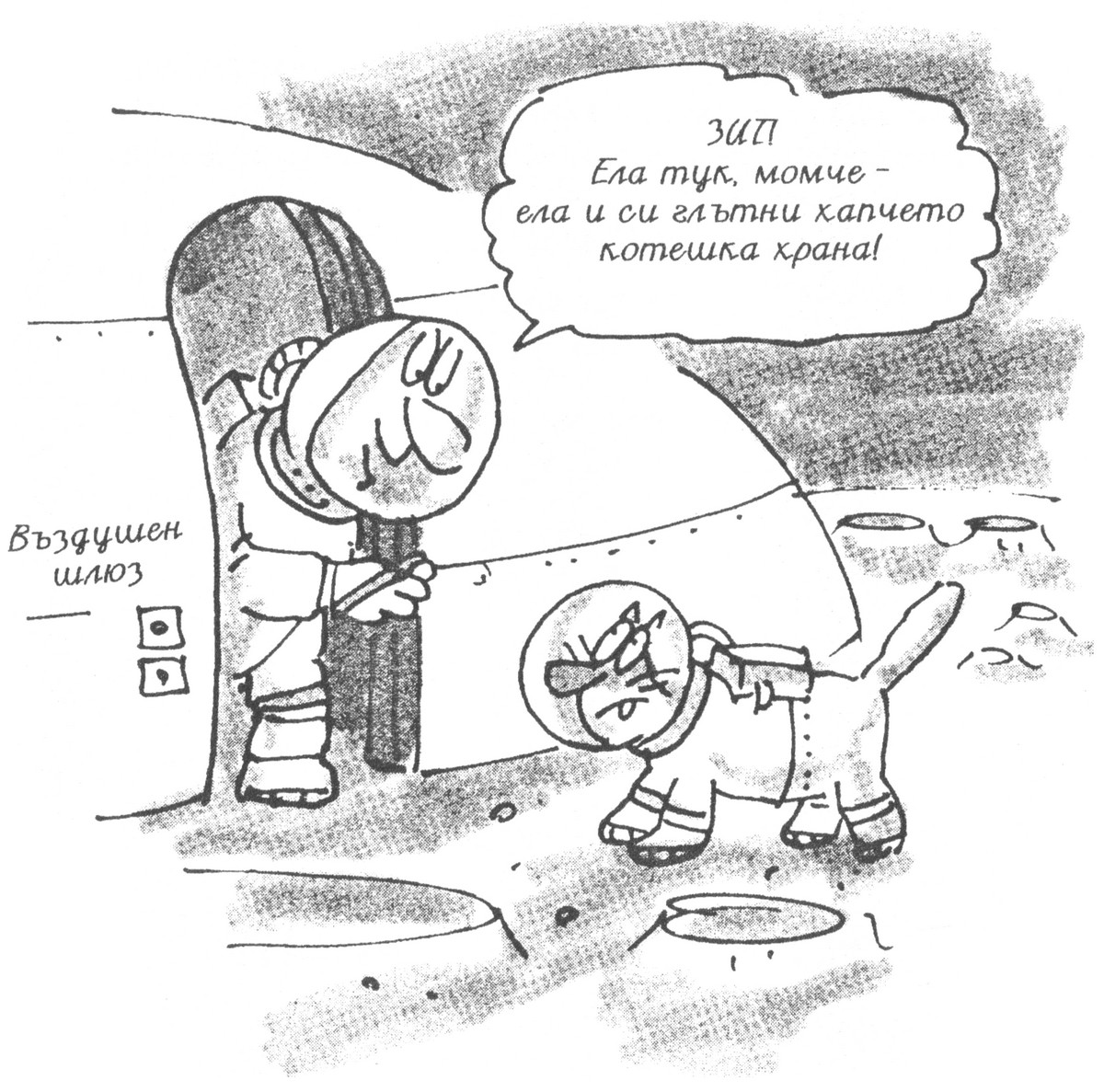 Но е хубаво да мислим, че бъдещето няма да се окаже толкова лошо, колкото хората предсказват, т.е. ако то случайно даже съществува, то сред куполите и тръбите на някоя орбитална колония, след стотици години, динамични хора с упорити брадички, хора, които знаят как да копаят руда на астероидите и тям подобни, пак ще стърчат пред биомодулите си и ще блъскат по пластмасова чинийка с лъжица.