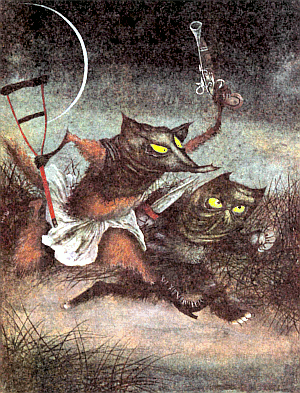На отвъдния бряг Буратино пусна лапите му, шляпна на земята, скочи и по мъхнатите хълмове, през камъша, се спусна да тича право към голямата луна над хълмовете.