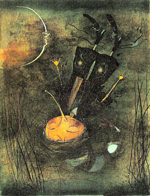 Когато той се показа като черничка сянка на края на брега, жабите изкрякаха след него: