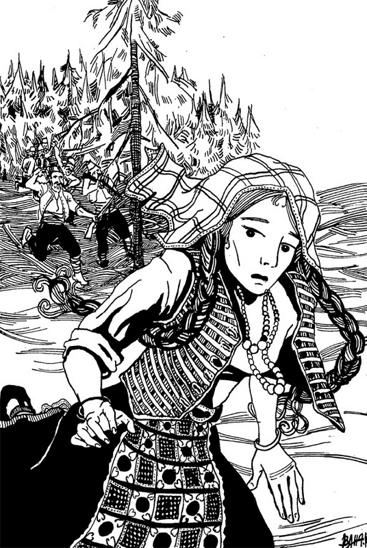 Измежду завързаните робини се открояваше една със своята хубост. Тя беше мома Ермена — най-личната в село Хаджийца. Славата й на голяма хубавица се носеше в близкото село Хърсово и в другите околни села. Лицето й беше овално, с бяла като мляко кожа. Черните й като маслини очи гледаха дръзко, дяволито. Снагата й беше тънка, гъвкава, разцъфнала като дива шипка. Не един ерген от близките села въздишаше по Ермена. Затуй сега я беше грабнал сам главатарят на черкезката банда. И как само беше пременена! Навярно е мислила така да бяга в гората. Синя джанфезена рокля, елече от ален атлаз, пъстра престилка. А на шията й се люлееха тежки нанизи от едри алтъни. Нейният похитител я беше сложил напреко на коня си.