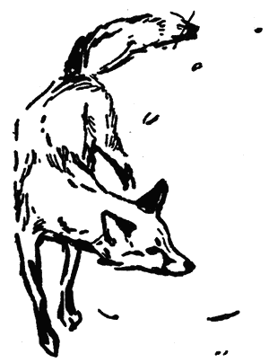 Край един храст се виждаше малка дупчица в снега. Лисицата пъхна острата си муцунка в тая дупка и извади късче замръзнало месо. Отначало го подуши предпазливо, налапа го и веднага го пусна. В устата й остана приятният му вкус. Тя се облиза и го погълна, без да го дъвче. Късчето беше малко като орех. То й се услади и тя забрави страха си. Подуши тук-там из снега, дано намери друго месо, и влезе в едрата гора. Но след малко вълчата миризма изведнъж удари в носа й. Лисицата настръхна и тутакси видя сивата козина на вълка да стърчи над снега на десетина стъпки от нея. Тя се изплаши и хукна към дола. Тича с големи скокове, размахва дългата си опашка, оглежда се и пак продължаваше да се мята надолу. Така достигна кладенеца, от който дядо Васил вземаше вода. Тук бреговете на дола се снишаваха и гората се отдръпваше. Щом се озова на открито, отново усети силна вълча миризма. Друг вълк, лежеше на самия бряг, забил муцуна в снега. Задните му крака достигаха водата, а предницата бе на брега.