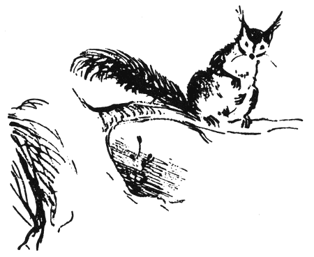 С катерицата работата не стоеше така. Жълъдът и лешниците в нейния склад бяха на привършване. Трябваше да се погладува, докато настъпи времето птиците да снасят яйца. О, тогава тя нямаше да губи нито минутка — щеше да претърси всички гнезда! Като си спомни за тия блажени дни, катерицата се облиза и реши да наточи зъбите си. На един дънер наблизо имаше сърнешки рог. Той стоеше там от есенес. Тя отиде да провери дали рогът е там. Да, той лежеше върху дънера. А дънерът беше загнил и почернял. Във вдлъбнатината му светеше локвичка като голямо черно око. Катерицата взе рога с предните си лапи и го изправи. Зъбите й заскърцаха по него. Това беше голям шум в гората. И всеки звук се чуваше далеч.