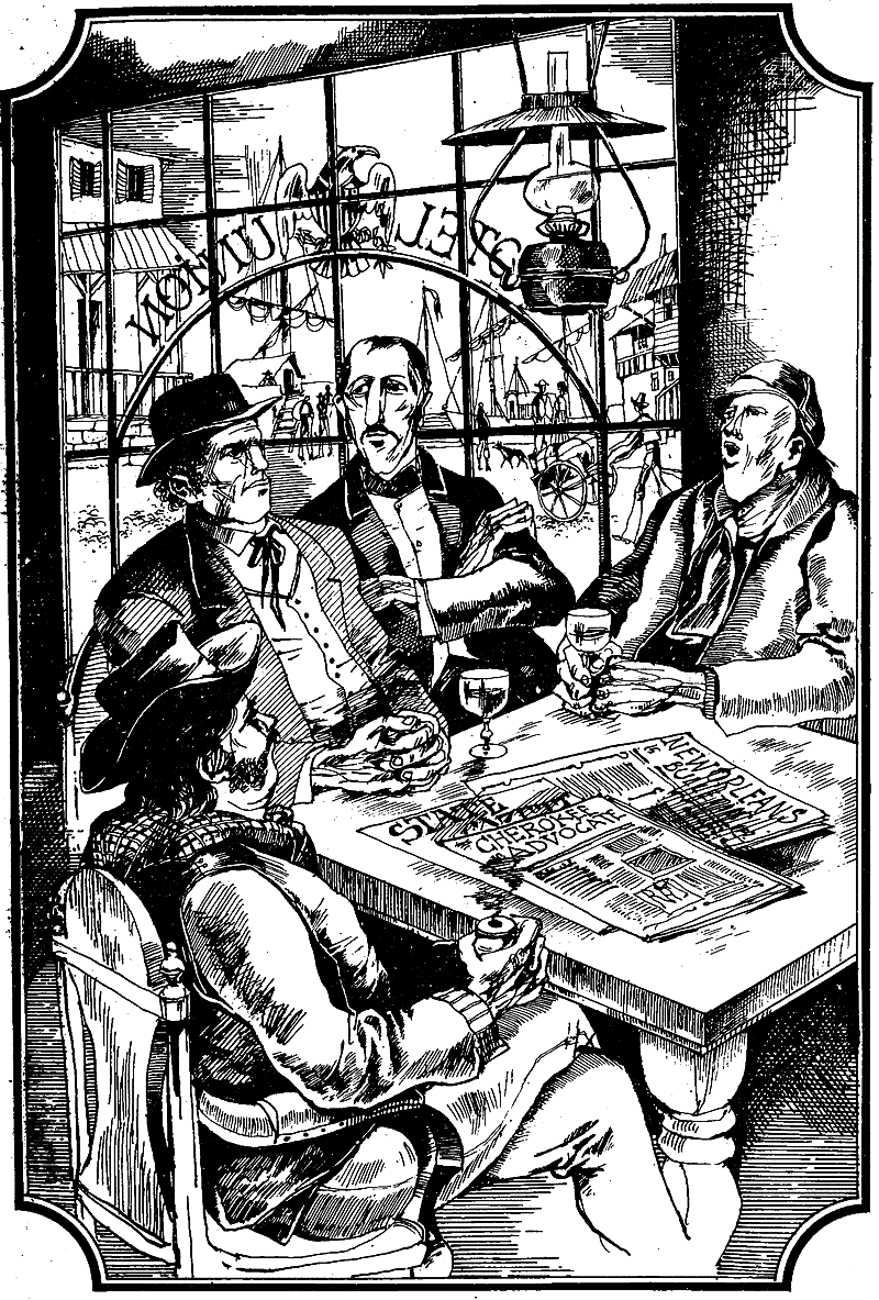 Хотел „Юниън“ не правеше изключение от това правило. Срещу вратата се намираше тезгяхът, зад който един млад човек, изглежда, едва намираше време да напълни поръчаните чаши. Вляво беше камината, вдясно два прозореца гледаха към „Елмстрийт“, а два други прозореца до вратата откриваха гледка през верандата към широката „Фронт стрийт“ и същевременно към пристаните за параходи и лодки, както и към реката. В средата на доста обширното помещение бе поставена четириъгълна маса и дузина столове. На масата се намираха няколко вестника — „Стейт Газет“, „Чероки Адвокейт“ и „Ню Орлиънс Булетин“. Малко огледало и неизбежният американски часовник над камината допълваха мебелировката.