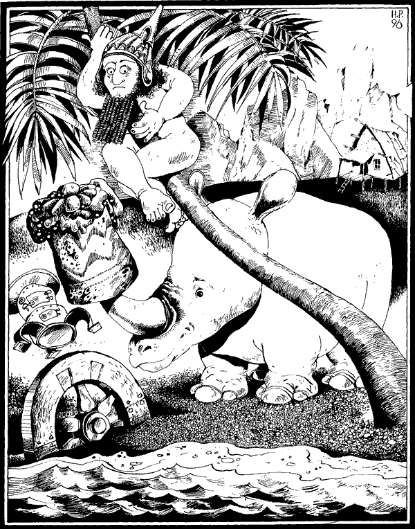 Черното във водата близо до брега не е останка от кораб, а нещо съвсем друго. Това е Строркс, Носорогът, който се къпе без кожата си. Той и без кожа си е толкова черен, колкото със. А за готварската печка, на твое място, не бих питал много.