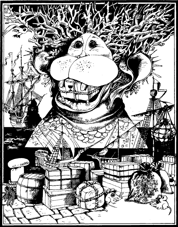 Тази рисунка показва Звяра, който излезе от морето и изяде сам храната, приготвена от Сюлейман-ибн-Дауд за всички животни на света. Този Звяр беше много мил и майка му много обичаше и него, и неговите двайсет и девет хиляди деветстотин деветдесет и девет братя, които живееха на морското дъно. Ти знаеш, че той беше най-малкият от тях — затова му викаха „Малчо“. Той излапа сандъците, балите, пакетите и прочие, които бяха приготвени за всички животни, и то заедно с опаковките и въжетата им, и пак нищо не му стана. Пръчките, които се виждат зад сандъците, са мачтите на Сюлейман-ибн-Даудовите кораби. От тях стоварваха още храни, когато Малчо изскочи от морето. Той не изяде корабите и ти можеш да видиш как някои от тях преспокойно плават край рамото му. Не съм нарисувал самия Сюлейман-ибн-Дауд, но той е наблизо и е много смаян. Чувалът, който виси от мачтата в ъгъла, е пълен с пресни фурми, които са предназначени за папагалите. За имената на корабите не мога да кажа нищо, защото не ги зная. И това е всичко.
