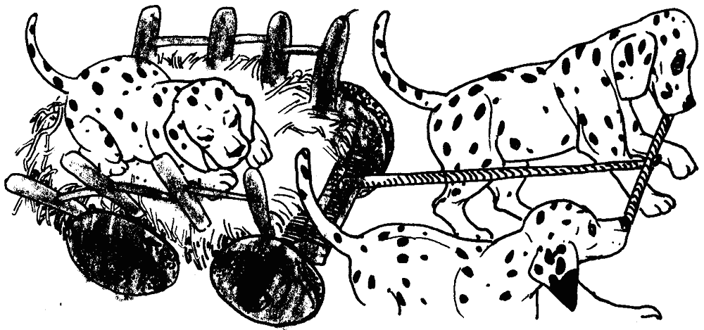 — Ще можете да изберете две кученца с еднакви размери продължи Полковникът, — а те ще хванат напречно дървото със зъби и ще дърпат каручката. При нужда кученцата, които са отзад, ще бутат с носовете си. Най-малката ви дъщеря ще се вози удобно в сеното, а ако някое друго се умори, ще сяда до нея да си почине.