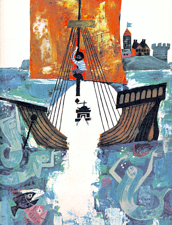 При тези думи, мелничката започна да мели сол, докато покри палубата като бял сняг, а екипажът се закатери по червената мачта, за да се спаси. Но колкото по-нагоре се качваха (а Лин се катереше най-високо от всички), толкова по-високо се натрупваше и тя. След време от тежестта на солта корабът докосна скалистото дъно и целият екипаж стана на туршия.
