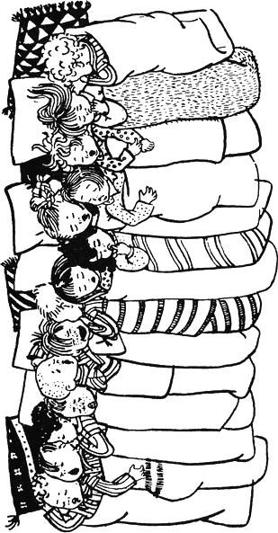 Най-хубавото на гощавката у леля Йени беше, че щяхме да пренощуваме там. Обичам да спя на чужди места. Всичко ти се струва някак необикновено и странно. Мирише съвсем другояче от вкъщи. Бяхме четиринайсет деца на гощавката и всички щяхме да спим заедно на пода в гостната, където играхме. Да знаете колко е весело да спиш на пода! Сложиха ни сламени дюшеци, но без чаршафи, а само с одеяла. След като си легнахме, влязоха всичките възрастни да ни видят.