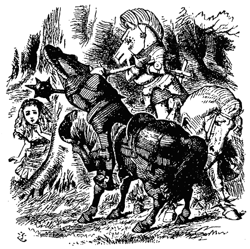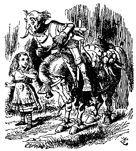 — Е, сега се диша по-лесно — Рицаря приглади с ръце разчорлената си коса и се обърна към Алиса. Имаше мило лице и големи кротки очи.[2] Тя реши, че никога през живота си не е виждала войник, който да изглежда толкова странно.