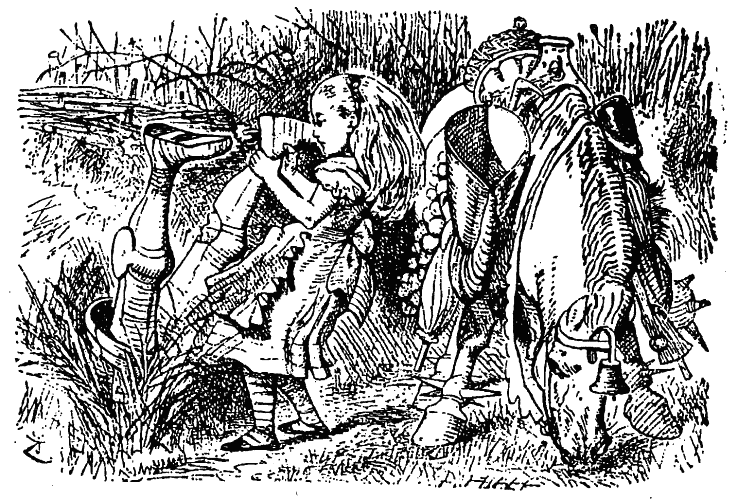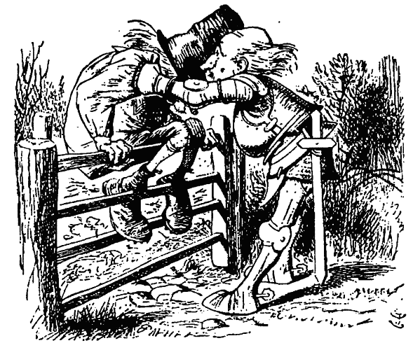 „Май няма да е много удобно“ — помисли си Алиса и известно време вървя мълчаливо, чудейки се на идеята му, като сегиз-тогиз спираше да помогне на горкия Рицар, който съвсем не беше кой знае колко добър ездач.