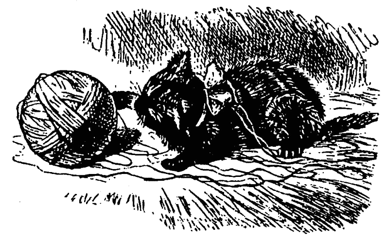 Дайна вече беше успяла да измие черното котенце по-рано, та затова, докато Алиса се гушеше, свита на кравайче в ъгъла на огромното кресло и си мърмореше в полудрямка нещо под носа, то си устрои една хубава лудешка гоненица с кълбото прежда, което Алиса преди това бе навила много старателно. И го търкаля по пода насам, и го търкаля натам, докато го размота докрай — и ето ти на — сега цялата черга беше покрита с омотани и опетлани като кълчища конци, а насред всичко това котето най-нехайно си гонеше опашката.