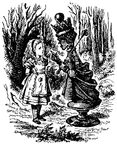 — При първия ход пешката прескача едно квадратче. Значи, трябва да минеш много бързо през третия квадрат — според мене ще е най-добре да хванеш влака и за нула време ще стигнеш в четвъртия квадрат. Е, този квадрат е на Туидълдум и Туидълдий. Петият е пълен най-вече с вода, а пък шестият е на Хъмпти-Дъмпти. Ама ти какво така се умълча?