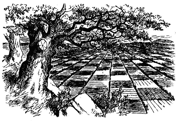 Известно време Алиса не пророни нито дума — само оглеждаше местността във всички посоки. Ама че интересна местност беше! Няколко поточета я прекосяваха от край до край, а земята между тях беше разделена с живи плетища на квадрати, които я преграждаха от поточе до поточе.