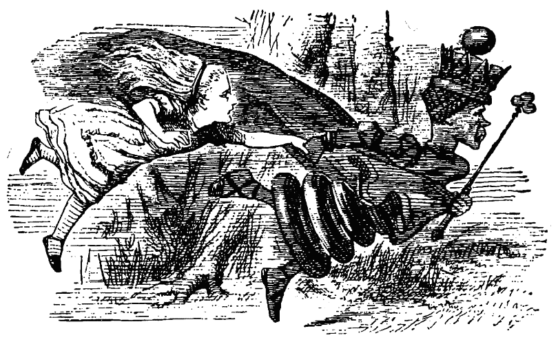 Не че на Алиса изобщо й бе хрумвало да приказва. Толкова се беше запъхтяла, че й се струваше, че никога вече няма да може да приказва; а Царицата продължаваше да си крещи: „Давай по-бързо! Давай по-бързо!“ и да я влачи подире си.