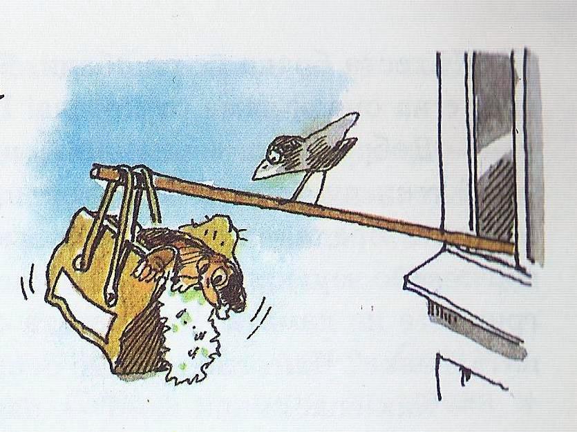 Боже господи! В първия миг Мъхеста брада дори затвори очи от ужас, но след малко все пак си наложи да погледне. Беше увиснал между небето и земята в буквалния смисъл на думата. През отвора на чантата погледът му се зарея чак до края на улицата, препълнена с хора. Ами ако падне сега долу? Чантата висеше окачена на дълъг прът пред един от прозорците на третия етаж. Ужас!