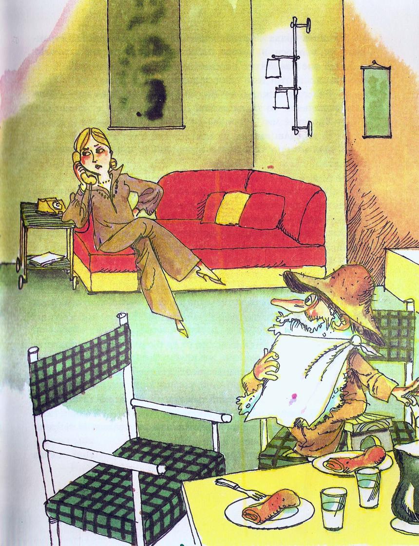 Когато взе да се смрачава, жената се зае да мие съдовете, но преди това настани Мъхеста брада на дивана. Той остана крайно изненадан, когато я видя да изнася празната чанта на прозореца.