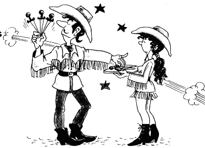 Хвърлячът на ножове се появи важно-важно и беше посрещнат с радостни викове. След него много по-скромно вървеше неговата асистентка в червен каубойски костюм. Тя носеше много на брой и различни по големина ножове върху голям поднос.