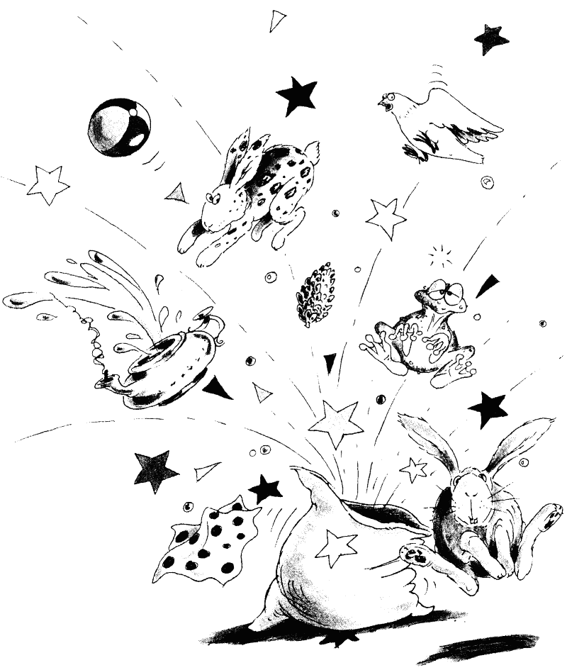 ЧУДО С ЧУВАЛ — беше изписано като заглавие. Лили прочете текста под него и се размисли. Там беше обяснено как човек може с трик да извади от чувал всичко, каквото си поиска: малки зайчета, големи зайци, черни, бели и шарени зайци, костенурки, жаби, гълъби, топки, кандила, носни кърпички и шишарки. Всичко възможно — но за съжаление нямаше заклинание за магически пръчки.