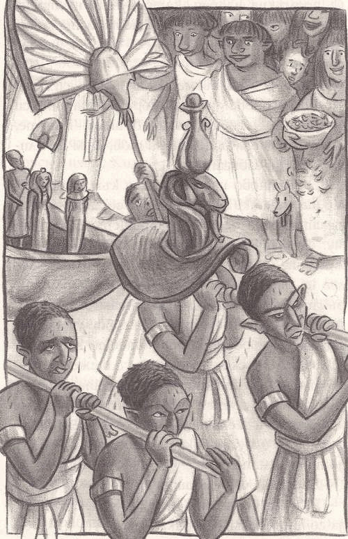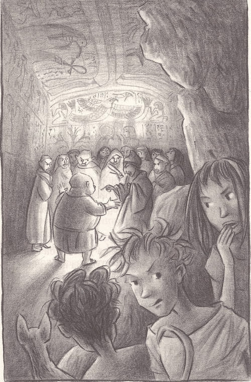 Децата надникнаха предпазливо иззад скалното си укритие, жрецът с белега на ръката бе застанал в гробна камера, осветена от множество маслени лампи. Стените й бяха украсени с прекрасни стенописи. Около жреца десетина мъже клатеха одобрително глава, докато го слушаха.
