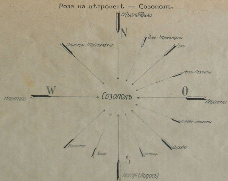 Още при пръвъ разговоръ съ обикновенъ рибарь на Созополъ или Месемврия васъ ви поразява фактътъ, че той познава много вѣтрове, кой до колко е полезенъ или вреденъ за платноходството, както и че той дава отдѣлно, самостоятелно име на всѣки вѣтъръ. Рибаритѣ и мореходцитѣ тукъ сѫщо си позволяватъ да предвиждатъ времето: за деня — отъ утрото, или за следващия день. Затова за вѣтроветѣ, които духатъ въ Созополъ и околностьта му, ще кажа нѣколко думи, възъ основа на най-добритѣ мѣстни наблюдатели практици.