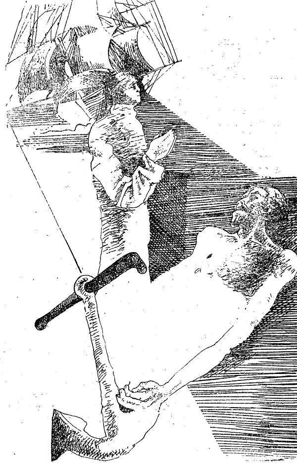 Този пръв поглед, който обхванал десетте фигури и още десетки по-малко биещи на очи, се спрял само за миг на тях, тъй като посетителят не можел да понася врявата от гласовете им, и се обърнал да види кой е командирът на кораба.