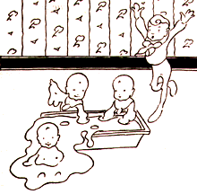 И баба замина. Аз подкладох силно печката гореща. Цял във пот потънах, поседнах насреща. Но много не мина, и при мен довтаса весела дружина — тримата юначни малки патиланци.