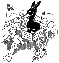 И свикахме ние помагачи здрави, па го настанихме със мъки големи. Впрегнахме се всички. Напънахме дружно — вкъщи да го върнем. Заскърца колата. А наш Дългоушко изправи главата, че като отвори онова гърлище: „Аха-ъха-а-ъха-а! Излезте ме вижте!“ Докато погледнем, пътят се заприщи. Наизлезе вънка мало и голямо. И всеки се чуди, и всеки се мае — тази колесница сред пътя каква е!