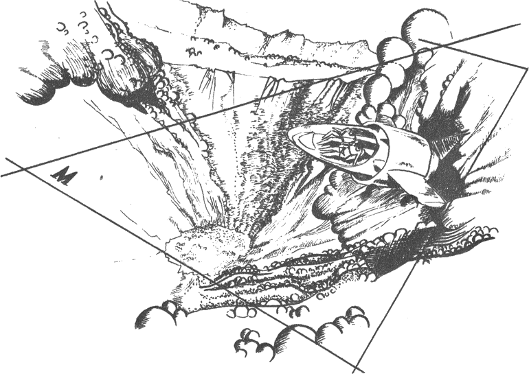 Ако се включеха уредите за следене, мъглата изчезваше. На екраните оставаше само лека мъгла, размиваща контурите на отдалечените предмети. И тогава се виждаха скалите. Или това, което условно можеше да се назове с тази дума, защото друга нямаше. То най-много напомняше гигантска шлака — нещо гъбесто, нещо спекло се в шуплите и с отворите, с арките, дълги стотици метри. И там в огромните дълбочини, в плетениците и проходите плуваше сега сигналът за помощ — тънкият писък на радиозумера. Многократно отразен, той се разливаше на вълни, ту се усилваше, ту отслабваше. Сякаш сигналът беше навсякъде. И невъзможно беше да се намери мястото, точката, от която той се излъчваше.