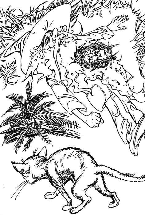 Но нищо повече не можа да измисли, а и нямаше време за размисъл — котаракът се метна като мълния към него, зелените му очи искряха от злост, а ноктите му се протегнаха напред към гнездото с пиленцата.