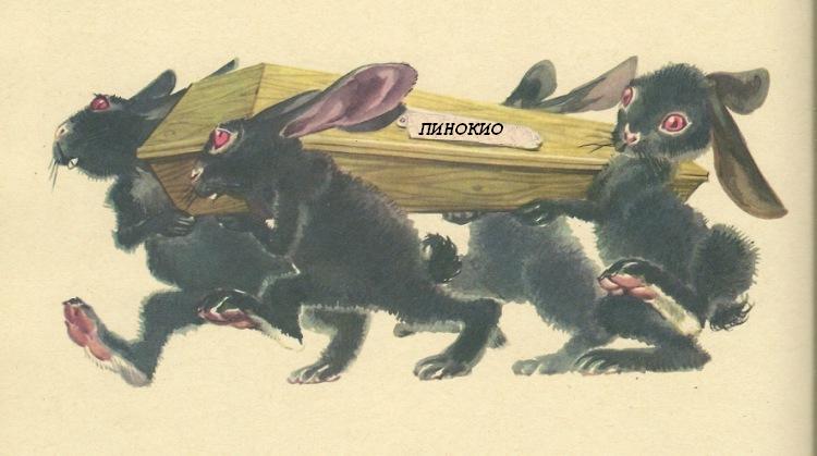 В тоя миг вратата на стаята се отвори и влязоха четири зайци, черни като мастило. Те носеха на рамената си малък погребален ковчег.