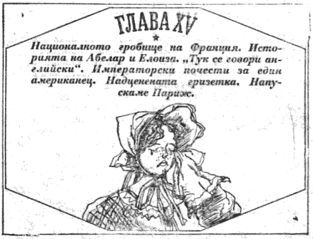 В Париж често виждахме по витрините надписа „Тук се говори английски“ — точно както у дома окачат надписи „Тук се говори френски“. Всеки път незабавно нахлувахме в тези места и неизменно получавахме на безупречен френски информацията, че продавачът, който говори английски, току-що е отишъл да обядва и ще се върне след час — не желае ли мосю да купи нещо? Чудехме се защо се случваше така, че тези хора обядват в странни и необичайни часове, понеже ние винаги се отбивахме по време, когато не е никак вероятно един образцов християнин да излезе с подобно намерение. Истината е, че това беше долна измама, капан за непредпазливите, плява за ловене на новоизлюпени пиленца. В тези магазини нямаха никакъв продавач, измъчващ английския. Те се надяваха, че надписът ще подмами чужденци в бърлогите им и че собствените им ласкателства ще ги задържат там, докато купят нещо.