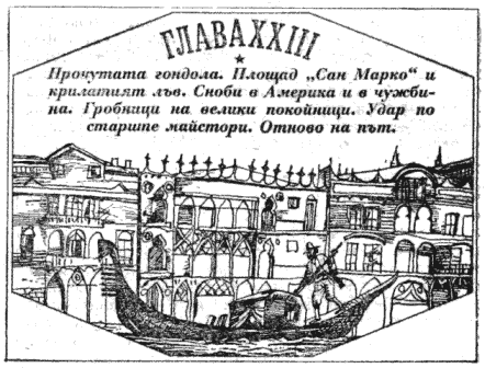 Прочутата гондола. Площад „Сан Марко“ и крилатият лъв. Сноби в Америка и в чужбина. Гробници на велики покойници. Удар по старите майстори. Отново на път.