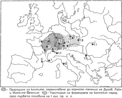 Карта I. Прародината на келтите. 1 — Амфревил, 2 — Сом-Бион, 3 — Валдалгесхайм, 4 — Ла Тен, 5 — Мюнсинген, 6 — Анзерюн, 7 — Антремон, 8 — Теламон, 9 — Дюрнберг, 10 — Духцов, 11 — Циумещи, 12 — Бибракт, 13 — Алезия, 14 — Орнавасо, 15 — Хайденграбен, 16 — Манхинг, 17 — Завист, 18 — Старе Храдиско, 19 — Карабурма, 20 — Холцхаузен