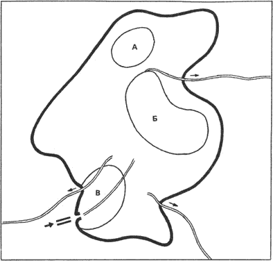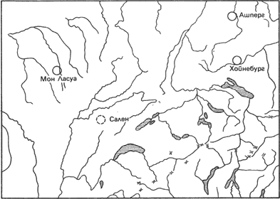 Рис. 5. План на Бибракт с обозначение на кварталите. а — светилище; б — седалище на владетеля; в — занаятчийски квартал (по Дешелет)