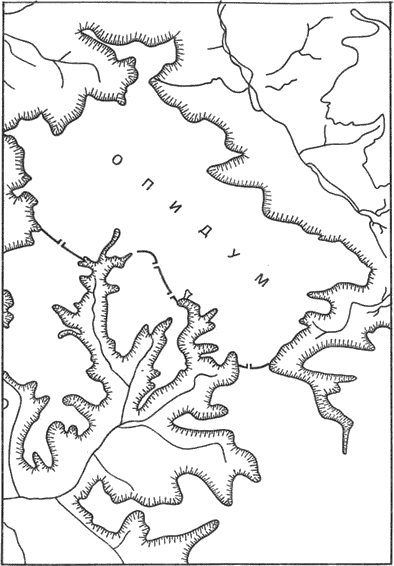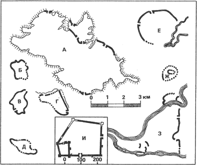 Рис. 4. Сравнение на големината на опида. а — Хайденграбен; б — Хоубирг; в — Бибракт; г — Финстерлор; д — Алезия; е — Манхинг; ж — Щафелберг; з — Кенхаим; и — Севтополис (по Фишер)