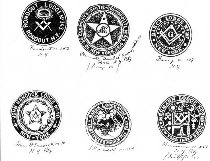 Печати на масонски ложи в САЩ от XIX и началото на XX век. Повечето от тях имат за отличителен знак пентаграмата — петолъчката. Този знак е пренесен трайно и в комунистическата символика от масоните-евреи — Троцки, Ленин, Свердлов, Зиновиев и други.