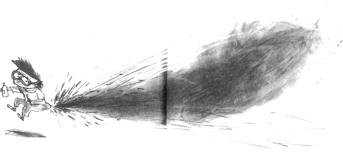 Сега Бюле разбра, че очилата не са за плуване, а за мотоциклет. Цялото лице на доктор Проктор беше почерняло от сажди. Само на мястото под очилата се виждаха два бели кръга. Той се втурна към една епруветка и изля съдържанието й в шишенце, покрито със сито.