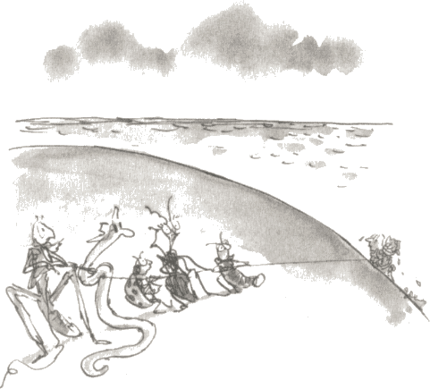 Трябваше да издърпат дългата около километър нишка, но те се захванаха здраво за работа и накрая от ръба на прасковата се появи Джеймс, целият мокър, с подгизналия господин Стоножка, вкопчен силно в него с всичките си четирийсет и два крака.