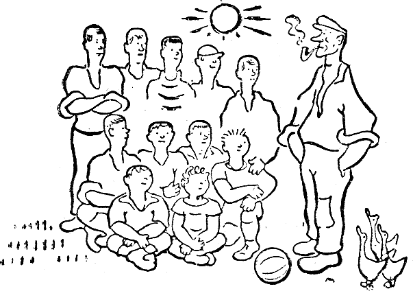 Живееше някога беден селянин на име Клапзуба, който имаше единадесет сина. Той бе толкова беден, че не знаеше как да нареди синовете си, и затова образува от тях футболен отбор. Край колибата си имаше хубава, равна ливадка, която превърна в игрище, продаде козата, купи с парите две футболни топки и момчетата започнаха да тренират. Най-големият, Хонза, беше страшен дългуч, затова застана на вратата, а най-малките, Франтик и Юра, бяха дребни и пъргави, тях старият Клапзуба постави да играят крила. Сутрин още в пет часа той събуждаше момчетата и ги повеждаше на бърз едночасов поход в гората. Когато изминаваха шест километра, те се обръщаха и се втурваха в тръс към къщи. Едва тогава получаваха закуска и започваха да тренират. Старият Клапзуба следеше строго всеки играч да знае всичко. Той ги учеше да поемат топката във въздуха, да я спират, да подават, да финтират, да стрелят от място и в движение, от земята и от воле, да центрират, да връщат топката назад, да дриблират, да играят с глава, да бият дузпа и корнер, да хвърлят тъч, да умъртвяват топката, да я спират с гърди, да правят комбинации между тримата вътрешни нападатели или между един вътрешен, крило и полузащитник, да подават на крилата, да предприемат нападения или да ги спират, да пускат дълги пасове, да вкарват голове, да използуват многоходови комбинации, да преварват, да се пласират, да изчистват топката с плонж, да я фалцират, да лъжат, да не са в засада, да прескачат подложения им крак, да играят с един защитник, да ритат боц, външно, с коляно, вътрешно, с пета. Както виждате, много неща трябваше да научат момчетата на Клапзуба и то далеч не бе всичко. Към това се прибавиха още специалните тренировки по бягане и скачане. Трябваше да могат да бягат всички разстояния от петдесет ярда до две мили, да усвоят скока на дължина, на височина, овчарски скок, троен скок, бягане с препятствия и главно — бързо да стартират. Но и то не беше всичко: трябваше още да хвърлят гюлле, копие и диск, за да заякнат мишците им, да упражняват борба класически стил, за да се развият мускулите на тялото им, и да теглят въже, за да станат снагите им като желязо. Но преди всичко правеха дихателни упражнения с леки игри, защото старият Клапзуба казваше, че без правилно дишане и нормален пулс всяко упражнение е просто убийствено. С една дума, имаха толкова работа, че по пладне дотичваха в къщи гладни като вълци, изгълтваха обеда и дори облизваха дъната на тенджерите и тавите. После лягаха един до друг на пода или на земята в дворчето и почиваха един час. При това не приказваха много-много, всеки бе доволен, че може да лежи, без да се помръдва. След един час старият Клапзуба изтърсваше лулата си, свирваше и момчетата отново се залавяха за работа. Привечер и баща им обуваше футболни обувки и се присъединяваше към синовете си, за да станат дванадесет и да могат да играят по шестима на двете врати. Вечер нахълтваха в къщи като пълноводна река, Клапзуба ги масажираше един след друг, лисваше върху всекиго по три ведра студена вода (в колибата нямаха душ), после им даваше лека вечеря и като си поприказваха малко, ги прогонваше да спят. На сутринта всичко започваше отначало и така ден след ден, цели три години. На края на третата година Клапзуба отскочи до Прага и донесе една табелка, която закова на вратата. Тя имаше синя рамка и по средата, на бяло