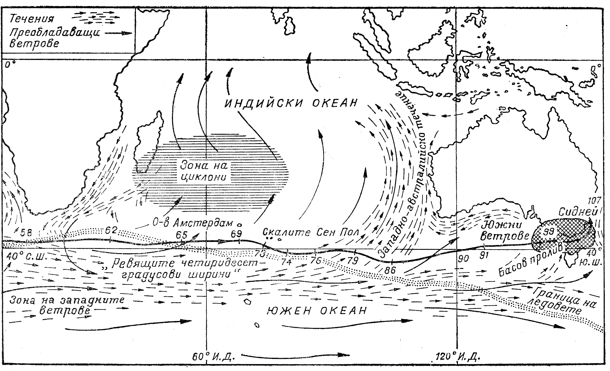 Какво очаквах аз от ревящите четиридесетградусови ширини? Яхтсмените не обичат много тази част от океана. Корабите рядко минават оттук, защото парните машини и Суецкият канал преместиха пътя за Австралия. От дневниците на клиперите имах впечатление, че тук духат устойчиви ветрове, които ден след ден гонят корабите по бурното море на изток. Естествено животът никога не отговаря на добре подредената схема, в каквато го превръща нашето въображение. Клиперите са правили велики преходи, които са останали в паметта на хората, но те също така са имали дни (пък и седмици) на мъчителни разочарования. От дневниците на големите кораби човек може да получи съвсем лъжлива представа за океана. В сравнение с „Джипси Мот“ „Къти Сарк“, „Термопили“ и другите техни събратя изглеждаха огромни. Щорм, който принуждаваше мен, самотния мореплавател, да легна на дрейф и да се оставя на милостта на вятъра и морето, за тях е бил хубав и благоприятен вятър. Имах достатъчно опит от самотното плаване с малки яхти, за да мога да преценя всички тези неща разумно, но между разумната преценка и емоционалната нагласа по отношение на реалността на нещата има голяма разлика. След като бях чел и изучавал морските преходи на клиперите, очаквах в ревящите ширини да срещна преди всичко устойчиви ветрове. А излезе точно обратното — непрекъсната смяна на щормове и затишия. Тези постоянни промени съвсем не минаваха гладко. Разликата между тях и всичко, което познавах дотогава, е като разликата между закачливите игри на котенцето и дързостта на тигърчето. Шкваловете, придружени с промени в посоката на вятъра, съвсем не напомнят плавното превключване на скоростите на автомобил от 20 на 25–30 мили в час, а по-скоро на яростно дръпване от 20 на 90–100 мили в час. Другото, което ми е трудно да опиша, а дори и да изкажа с думи, беше чувството на самота в този пустинен край на света. Бях свикнал със Северния Атлантик. Той е и страшен, и свиреп, но в неговата атмосфера присъствуват духовете на мъжете, които са го прекосявали на длъж и шир и са загинали в него. А тук, далеч в южните ширини на Индийски океан, царува велика пустота. Струваше ми се, че се намирам на космическо разстояние от останалото човечество.
