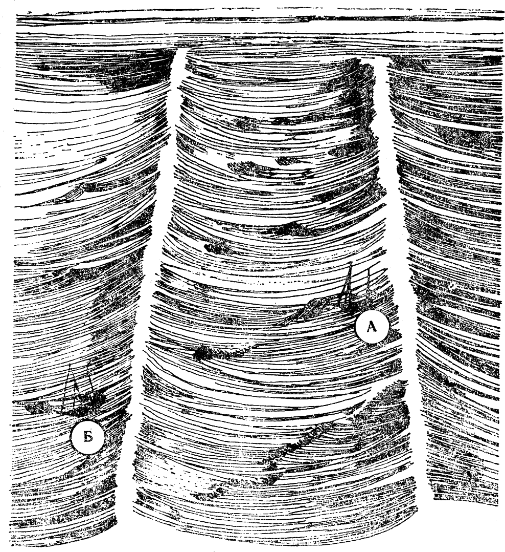 2.Способът да се посрещнат главните вълни под ъгъл 15-20° спрямо лявата кърмова част предизвикваше рязко накланяне, когато яхтата се спускаше по склона. Тогава дясната скула на носа се опираше във водата почти като ска или като изпъкнала лъжица. Това пречеше на вълнореза да се забие в някоя вторична вълна (вж. схемата).