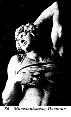 С това ние се връщаме отново в Рим и при оня страшен папа. Юлий II храни амбиции не само по отношение на католическата църква: той храни амбиции и по отношение на самия Юлий II и замисля да издигне в новия си храм най-голямата гробница на владетел от времето на Адриан. Какъв смайващ пример на superbia — мегаломания; по същото време и на Микеланджело не липсва тази черта. Няма да се разпростирам по въпроса, защо гробницата изобщо не е построена. Станало някакво спречкване — за героите не е лесно да търпят обществото на други герои. А и за нас няма значение как е щяла да изглежда гробницата. Единственото, което има значение, е, че някои от изработените за нея фигури са запазени, и те прибавят нещо ново към европейския дух — нещо, за което нито древността, нито големите цивилизации на Индия и Китай са могли някога да мечтаят. Вярно е, че двете най-завършени фигури ни отвеждат към антични образци, но Микеланджело ги е преобразил от атлети в пленници; единият се бори да се освободи — дали от тленността? — а другият чувствено се е примирил (86), „наполовина влюбен в освобождаващата смърт“.