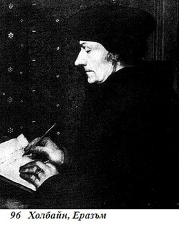 Той има достатъчно ясна представа за религиозния живот, за да знае, че църквата трябва да бъде реформирана — не само институциите й, но и учението й. Голямата цивилизаторка на Европа е заседнала на плитко, скована е от традиционни форми и имуществени интереси. И той знае също, че има много по-голяма надежда реформите да бъдат предизвикани от учението на човек като Колет, който просто иска хората да четат Библията така, сякаш вярват в нея, отколкото от изтънчените умове на Флоренция. Съвсем основателно е Еразъм да се възхищава от Колет. Но защо Колет и приятелите му се отнасят с такава почит към бедния, болнав и своенравен млад учен от Ротердам? Няма съмнение, че Еразъм е бил интелектуален чародей. Неговият чар прозира в писмата му и сигурно е бил непреодолим, когато се е намирал сред хора. Имаме голямо щастие, че можем да допълним писмата на Еразъм със зрими свидетелства, защото той е бил приятел на най-големия портретист на онова време — Ханс Холбайн. Портретите на Холбайн (96) ни показват Еразъм, когато е вече по-възрастен и известен, но те са така проникновени, че можем да си го представим на всяка възраст. Като всички хуманисти, бих казал почти, като всички цивилизовани хора и Еразъм придава много голямо значение на приятелството и много иска Холбайн да портретува английските му приятели.