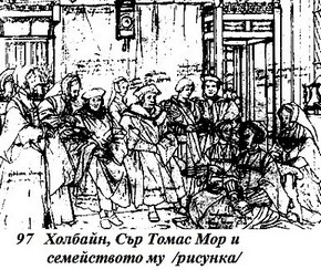 Така в 1526 г. Холбайн попада в Лондон и бива въведен в кръга около сър Томас Мор. Блестящият младеж, когото двадесет години преди това Еразъм така много е обикнал, сега е лорд канцлер; той е и автор на прочутата „Утопия“, където в малко странен стил препоръчва всичко онова, в което ще вярват фабианците през 90-те години на 19 век.
