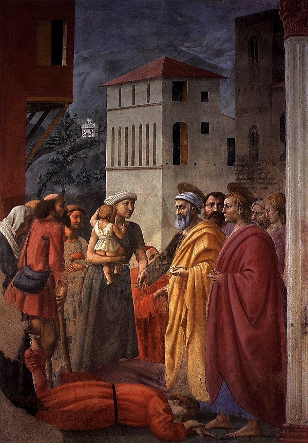 Апостол Петър раздава общото имущество на бедните 1426–1427 г. Фреска. Флоренция, църква Санта Мария дел Кармине, параклис Бранкачи.