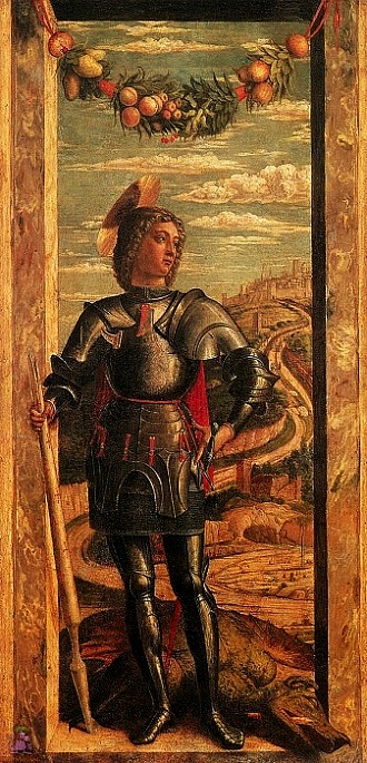 Класически красивата фигура на облечения в бойни доспехи млад воин излъчва горда радост и самоувереност. Той е застанал в мраморна рамка на преден план, но копието му излиза свободно от тази тясна рамка. Отвъд туловището на сразения змей се разгръща скалист пейзаж, по небето се носят ритмично начупени облаци. Тази картина се числи към най-привлекателните и най-колоритните творби на майстора; уравновесената композиция на фигурата, напомняща статуя, и подробното изписване на пейзажа отлично характеризират стила му. Картината е била вероятно предназначена за лявото крило на олтар.