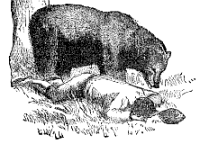 Двама души пътували заедно и внезапно една мечка се изпречила на пътя им. Единият от тях се изкачил бързо на едно дърво и се скрил в клоните. Другият, като видял, че мечката ще го нападне, се проснал на земята и когато тя се приближила и с муцуната си го подушила от глава до пети, той затаил дъх и колкото могъл се престорил на умрял. Мечката скоро го оставила, защото, както е известно, тя не се интересува от трупове. Когато се отдалечила достатъчно, другият пътник слязъл от дървото и шеговито запитал другаря си какво му прошепнала мечката на ухото.